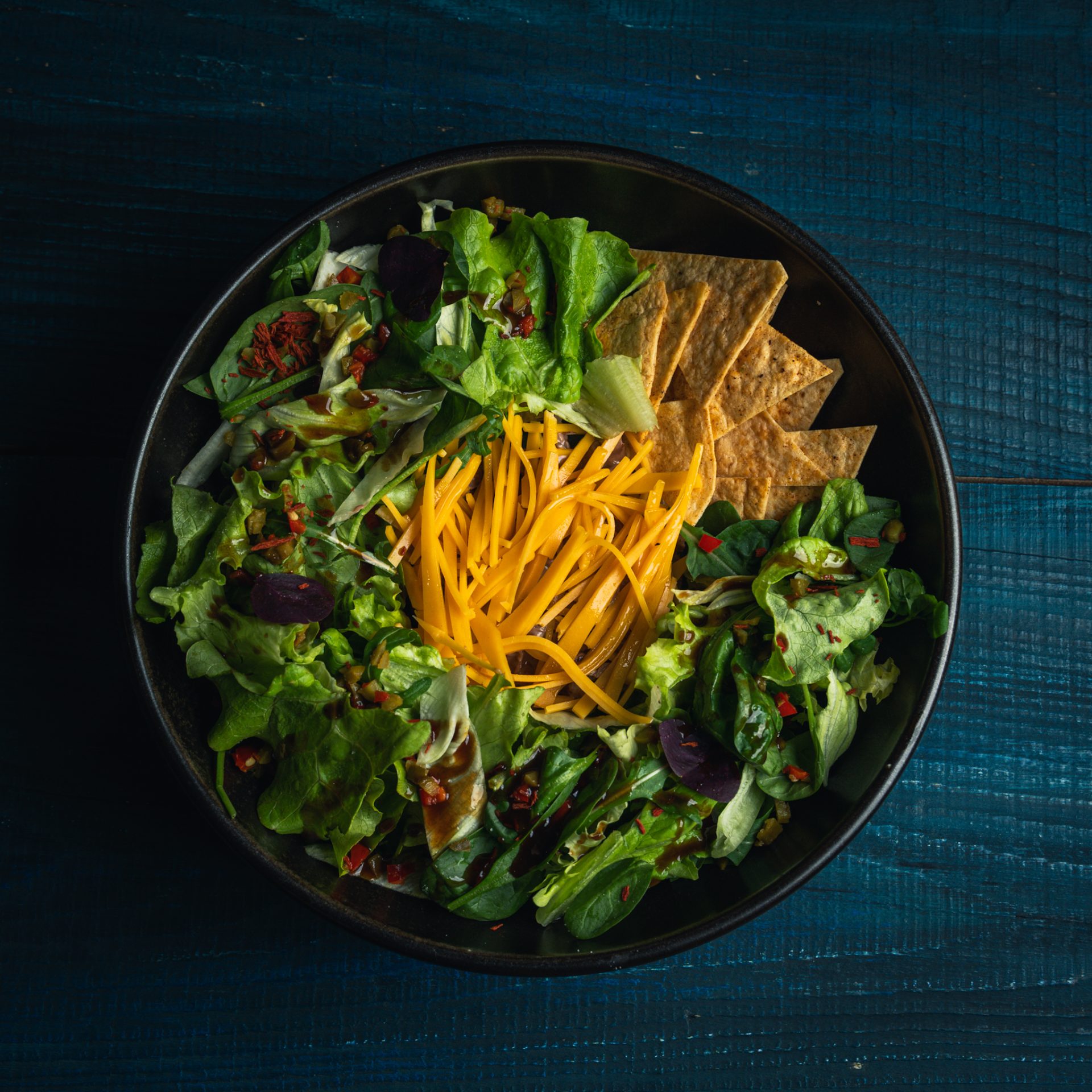 Mix de salate, nachos, sos Chipotle Mayo, chili marinat, castraveți murați, mușchi de vită, dressing Granada, cheddar, dressing TEXMEX
