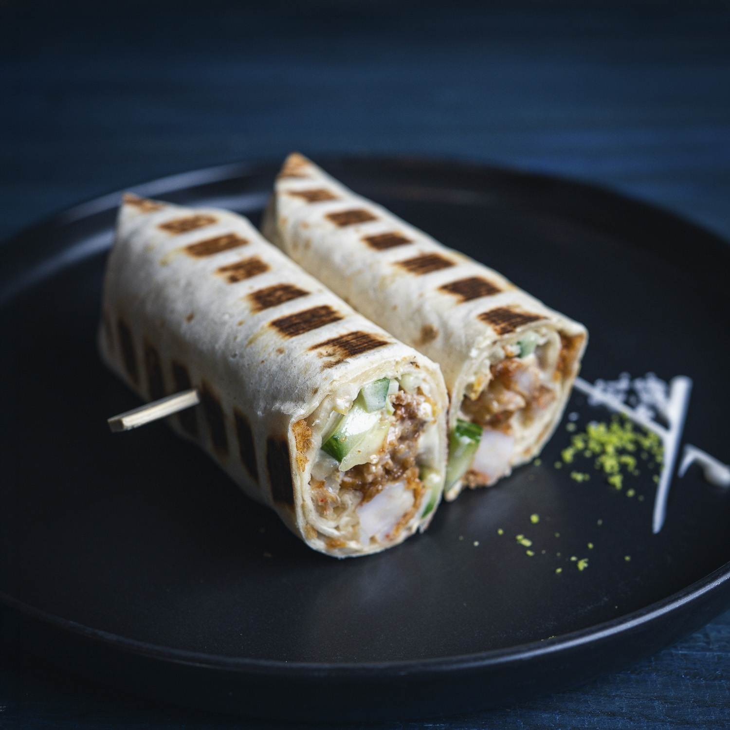 Tortilla, wasabi, panko shrimps, shimeji mushrooms, spicy horseradish sauce, TEXMEX dressing, baby spinach, cucumber, parmesan