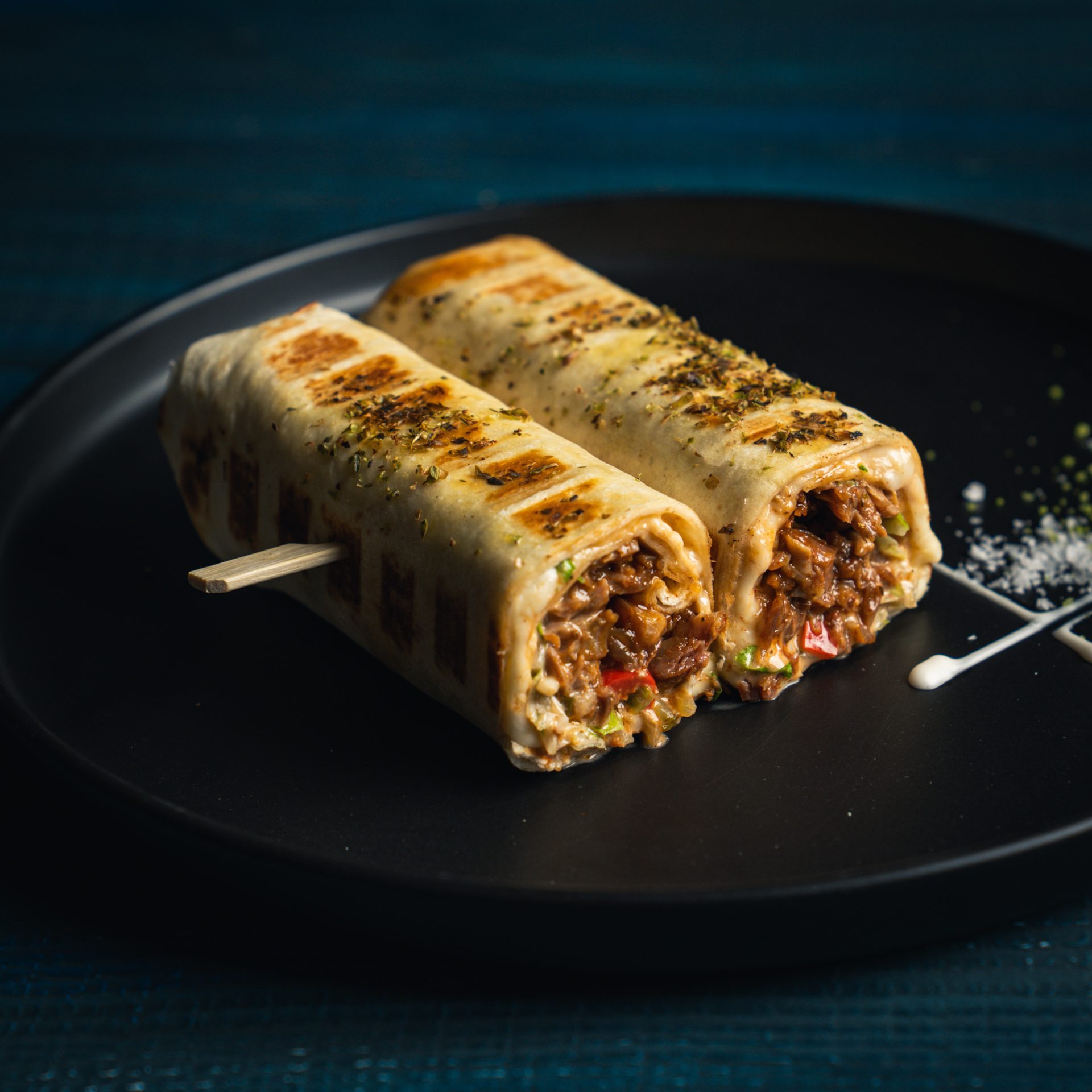 Tortilla, mozzarella, pork ribs with TEXMEX sauce, iceberg salad, Bostongurka, Chipotle Mayo sauce
