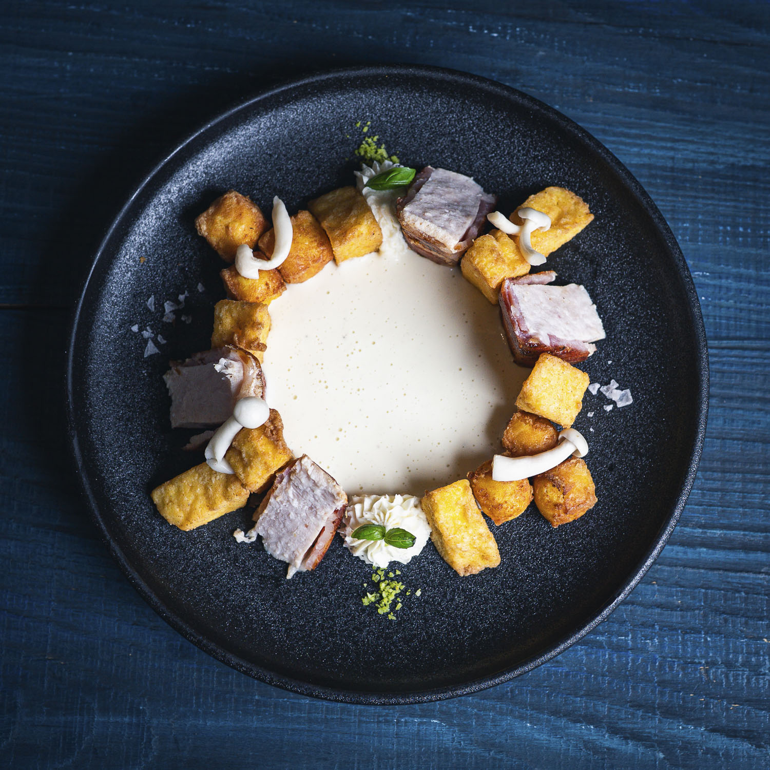 Turkey breast terrine wrapped in smoked bacon, fried balmoș, sous vide scrambled eggs, marinated shimeji mushrooms, cream cheese Bucryo, Burduf sauce, basil