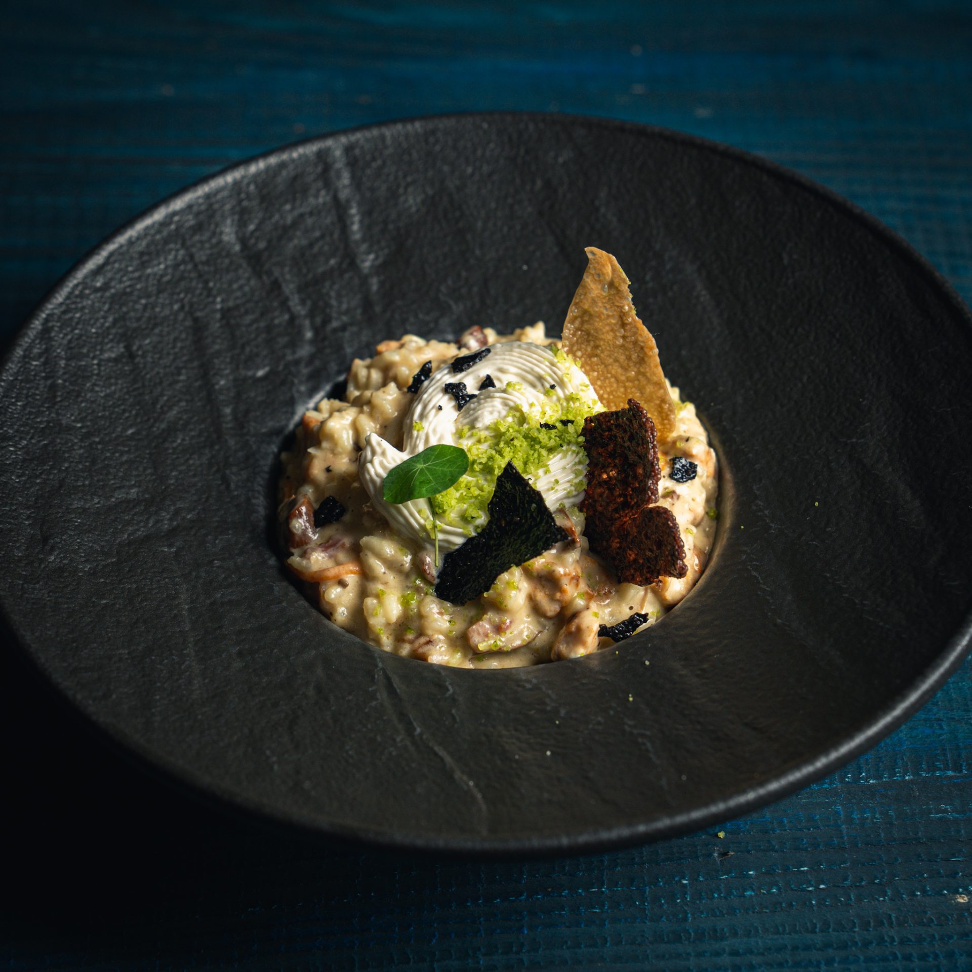 Risotto with marinated chicken breast, mushroom mix, truffle cream, bacon, heavy cream, Bucryo cream cheese, crispy black&white rice, parmesan with basil